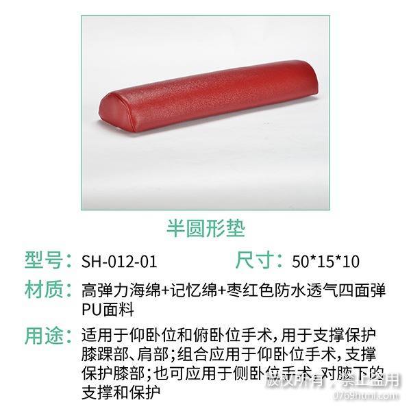 海綿體位墊系列中的半圓形墊,適用于仰臥位和俯臥位手術(shù),常用于支撐保護膝踝部、肩部、組合應(yīng)用于仰臥位手術(shù),支撐保護胸部和髖部;也可用于側(cè)臥位手術(shù)等,對腋下的支撐和保護。而且半圓形墊是手術(shù)室護理中較常用到的體位墊之一,常規(guī)尺寸為50*15*10,如果這個尺寸與您所找的尺寸不符合,也是可以進行定制服務(wù)