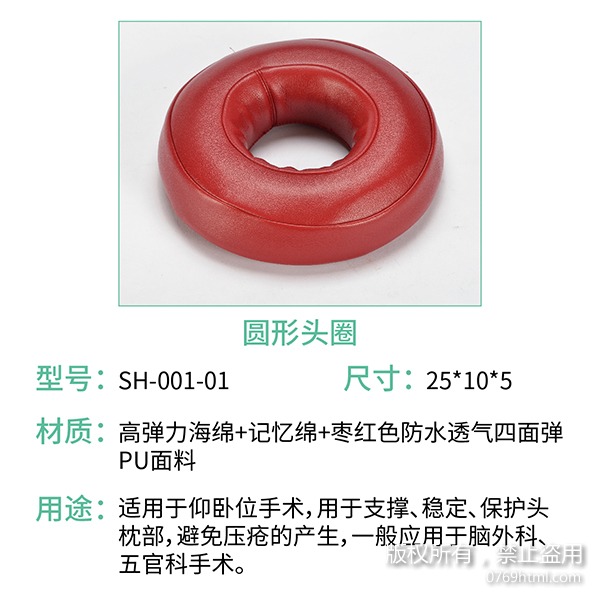 為了滿足廣大手術(shù)室要求,蒙泰護理與手術(shù)室臨床護理專家共同研發(fā)海海綿體位墊系列的圓形頭圈,外套采用棗紅色防水透氣皮料,海綿選用高彈力海綿和記憶棉拼接組合,高彈力海綿起到良好的支撐作用,記憶棉有良好的減壓性和柔軟性,多用于仰臥位手術(shù),支撐、穩(wěn)定、保護頭部,避免壓瘡的發(fā)生,一般應(yīng)用于腦外科、五官科手術(shù),是手術(shù)室仰臥位體位管理解決方案常用的海綿體位墊中的頭部體位墊。
